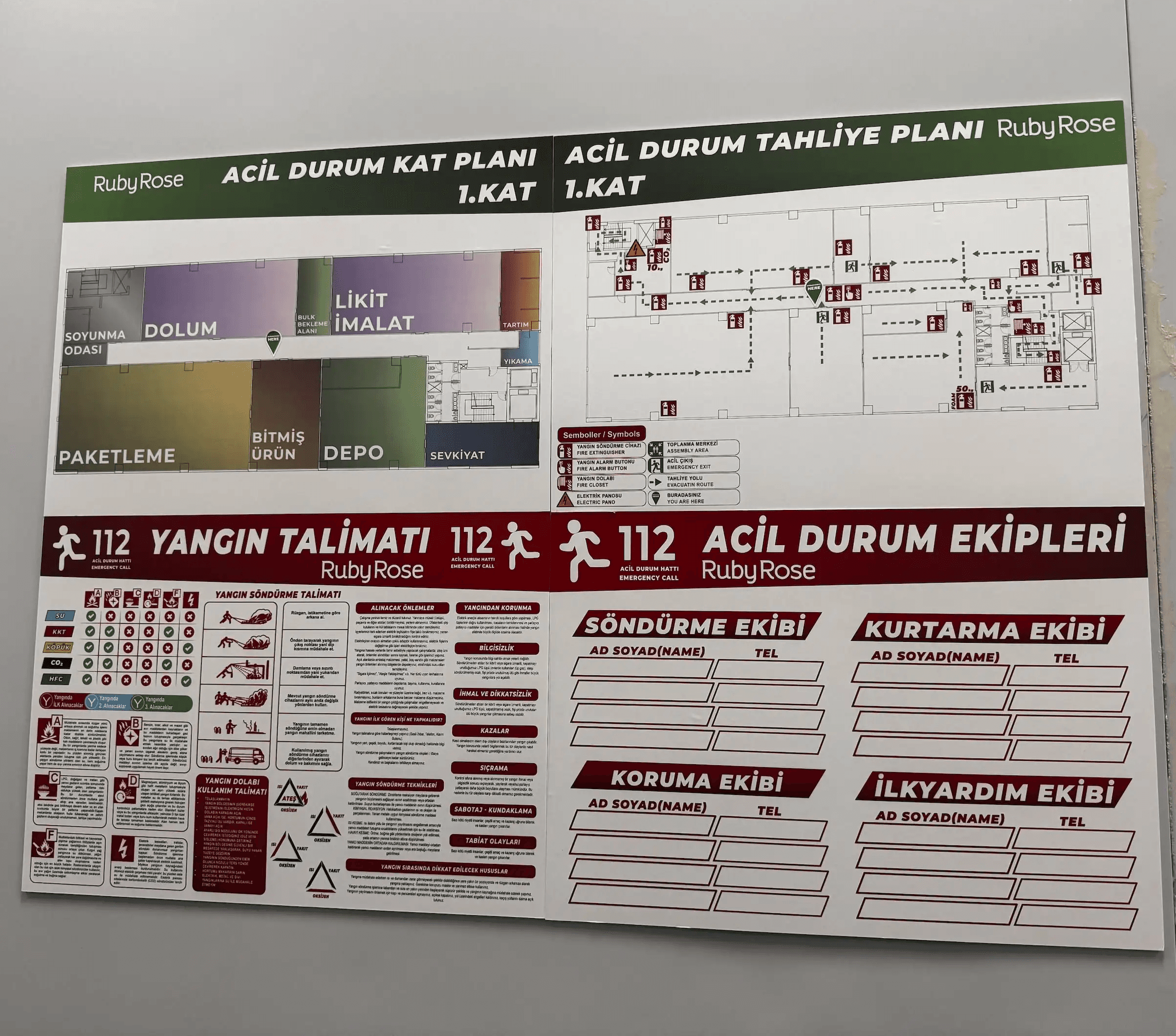 Ruby Rose için, yapının kullanım senaryolarını ve mekânsal organizasyonunu dikkate alan kapsamlı bir tahliye planı hazırladık. Projenin temel amacı, acil durum anlarında kullanıcıların yapıyı hızlı, güvenli ve kontrollü biçimde terk edebilmesini sağlayacak net bir yönlendirme sistemi oluşturmaktı.